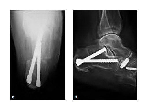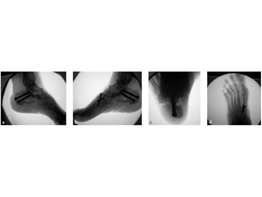 A medial displacement osteotomy of the calcaneus and transfer of the tendon of the flexor digitorum longus to the navicular fixed with an interference screw were performed (see Fig 2a-c). A fusion of the first medial cuneiformmetatarsal I, II, and III modified. Weil osteotomy was performed as well.