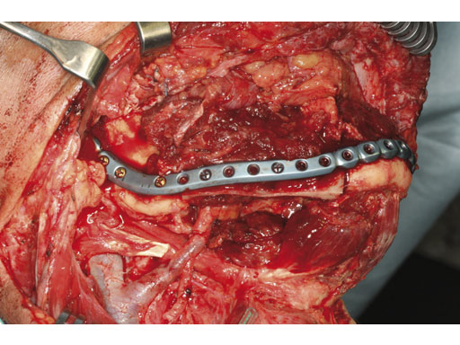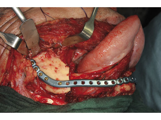 Case 2: A 65-year-old man suffering from an oral cancer in the anterolateral floor of the mouth with infiltration of the right mandible. The preformed reconstruction plate was applied to the lateral surface of the hemimandible prior to en bloc tumor resection, including a bone segment via extended submandibular access. The missing bone was replaced with a revascularized scapula border in combination with a soft-tissue parascapular flap. The patient has had no recurrence 1.5 years postoperatively.