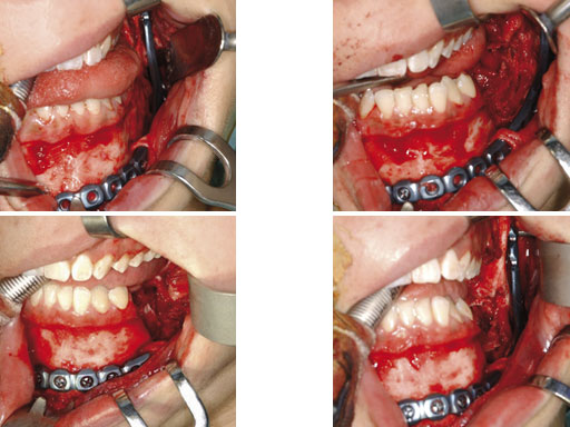 Case 1: A 27-year-old woman with an odontogenic myxoma in the left mandible. The preformed reconstruction plate was inserted prior to the tumor resection using a transoral approach with only a small additional transbuccal incision. To date the patient is free of symptoms with no signs of hypoaesthesia of the mandible and no signs of relapse. After another relapse-free period dental implants are planned for oral rehabilitation.
