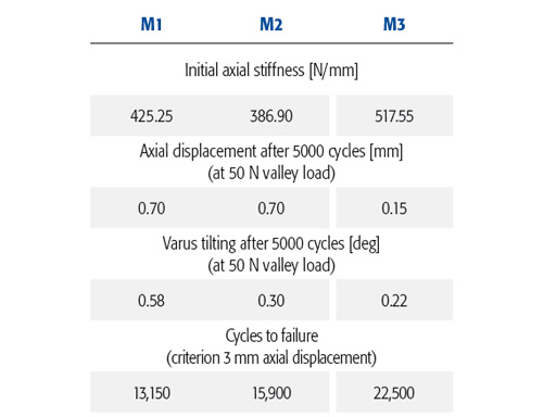 The MultiLoc PHN with a calcar screw and two screw-in-screw showed a superior initial axial construct stiffness, minimal axial displacement, reflecting highest head stability against migration along the nail, and highest number of cycles to failure during the cyclic test (Table 1). In addition, both options with two screw-in-screw aiming volumes in the posteromedial humeral part with better bone quality were superior with regard to varus tilting of the humeral head, compared to the standard configuration.