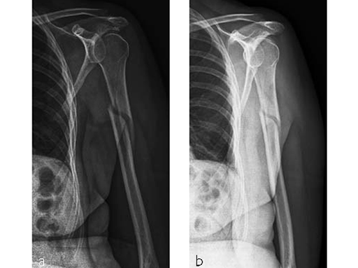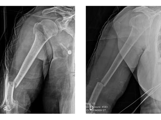 Following a fall downstairs, a 70-year-old woman sustained a head injury with intracerebral and subdural haematoma, as well as a complex fracture of the right humerus, representing a minimal displaced proximal and an oblique fracture in the distal part of the humerus (Fig 11).