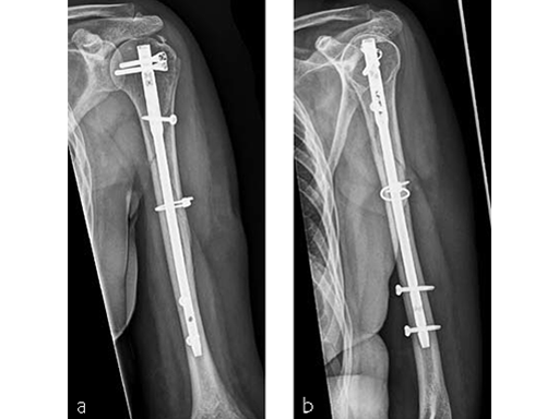 After neurosurgical intervention, surgery of the humerus was planned 10 days after the index trauma. The patient was still at the neurological intensive care unit and a preoperative clinical examination of the patient, regarding radial nerve palsy, was not possible. Therefore, a surgical revision with exploration of the radial nerve and an osteosythesis of the humerus using a long MultiLoc Humeral Nail was indicated.