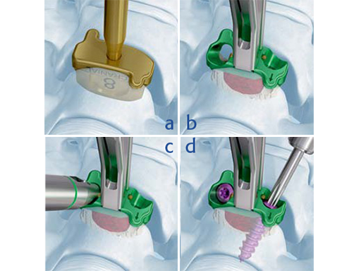 Zero-P VA main technique steps: a) Trialing 617, b) Spacer insertion, c) Screw hole preparation, d) Screw insertion