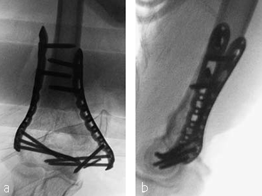 A 94-year-old man underwent surgery on his left elbow, using the VA-LCP Elbow Plating System. Plaster was used for soft tissue healing. The following images show intraoperative x-rays.