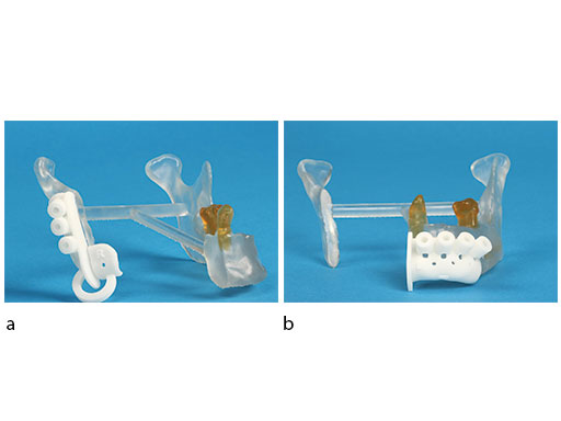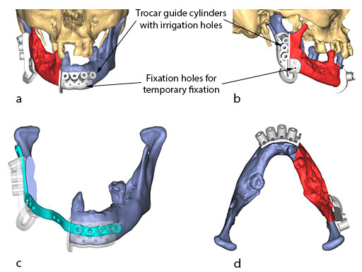 The flange for the posterior resection line conveys into a slot towards the inferior bony border. Just like the fibula cutting guides, the mandibular resection guides contain hollow cylinders for the mounting of the metal trocar drill guides, which exactly determine the patient specific plate screw hole position on the bony remnants. The transparent superimposition in Fig 9c reveals the interrelationship of the cylinders, the patient specific plate for mandibular reconstruction, and the underlying bony remnants.