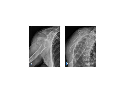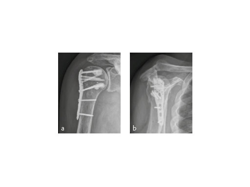 An 82-year-old male patient presented with a fracture dislocation of his right proximal humerus after a fall at home. Examinations revealed a highly unstable valgus-displaced 4-part fracture of the proximal humerus with a disruption of the medial hinge. No neurological injuries were evident (Fig 5).