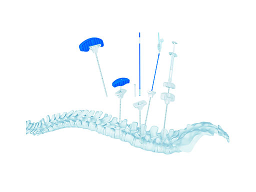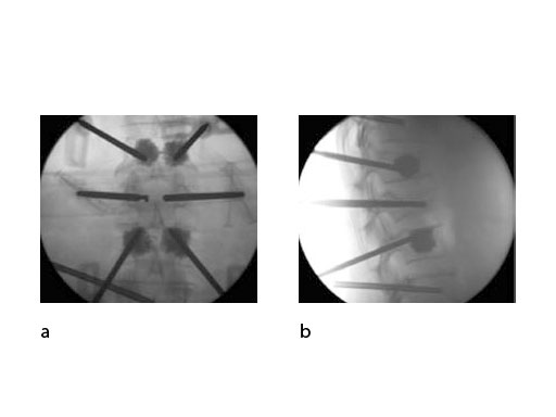 Both guide wire and trocar can be inserted through either a transpedicular (Fig 2a) or extrapedicular (Fig 2b) approach. The trocar allows access in a single step while the wire guide is first used to create a path for the access instruments.