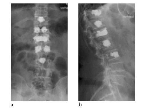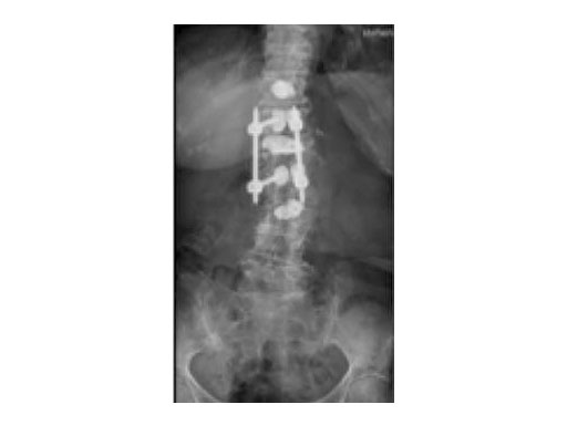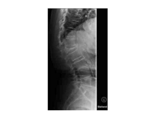 A 78-year-old woman was affected by steroid induced osteoporosis. She had persisting pain (mechanic and muscular) due to static imbalance (hyperkyphosis) and nonunion 8 months after a minor trauma with a vertebral compression fracture and vertebra plana of L1, and development of symptomatic stenosis of the spinal canal with loss of mobility over time. Pre-existing degenerative lumbar scoliosis was increased by the fracture.