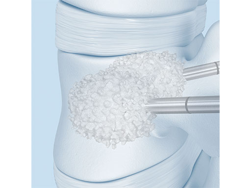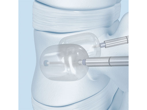 The controlled inflation of the balloons allows you to reduce the fracture and create a cavity in the cancellous bone. This containment can subsequently be filled using a legally-marketed bone filler adequately indicated for kyphoplasty and/or vertebroplasty procedures, to stabilize fractures in the vertebral body, prevent further collapse of the vertebra, and to reduce pain (Fig 6). The direction of the bone filler flow can be changed by orienteering the handle of the injection needle with the side opening.