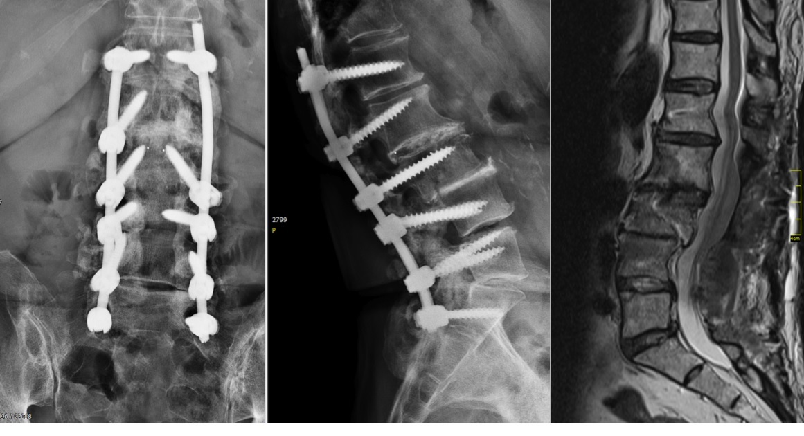 A 75-year-old female patient presented with postoperative back pain. She had been initially operated on eight years earlier with a laminectomy and fusion from L2 to L4. This proved to be successful for a number of years until a second operation was required for secondary back pain and left side leg pain. An extension of the decompression was performed with stabilization and fusion from L1 to S1. The rationale for this operation was unknown and the surgery failed to improve her symptoms.