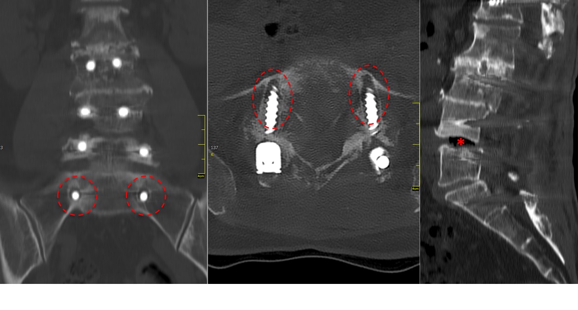 A CT scan allowed a more detailed assessment (Fig 7). There was an obvious nonunion at L5/S1, with loose screws in the sacrum (red circle). Furthermore, there was instability at L4/L5 as the intervertebral disc presented with an important vacuum phenomenon (asterisk). Foraminal stenosis at L5/S1 (not shown) seemed to be the reason behind the persistent leg pain.