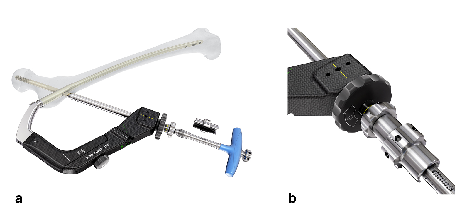 The TFNA offers surgeons the option to insert either a blade or a screw head element. The TFNA helical blade is designed to compress bone during insertion, which enhances implant anchorage and can reduce the risk of cut-out. As such it is regarded as particularly advantageous under osteoporotic bone conditions. However, there are still many surgeons that prefer to use the TFNA screw as the head element regardless of bone quality. Since these surgeons do not necessarily need the instrumentation that allows the insertion of either the blade or the screw, a screw-only aiming arm has been developed to further reduce instrument complexity and cost.