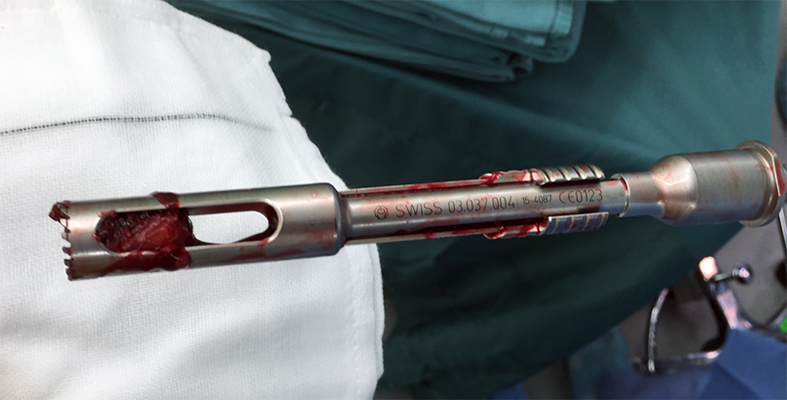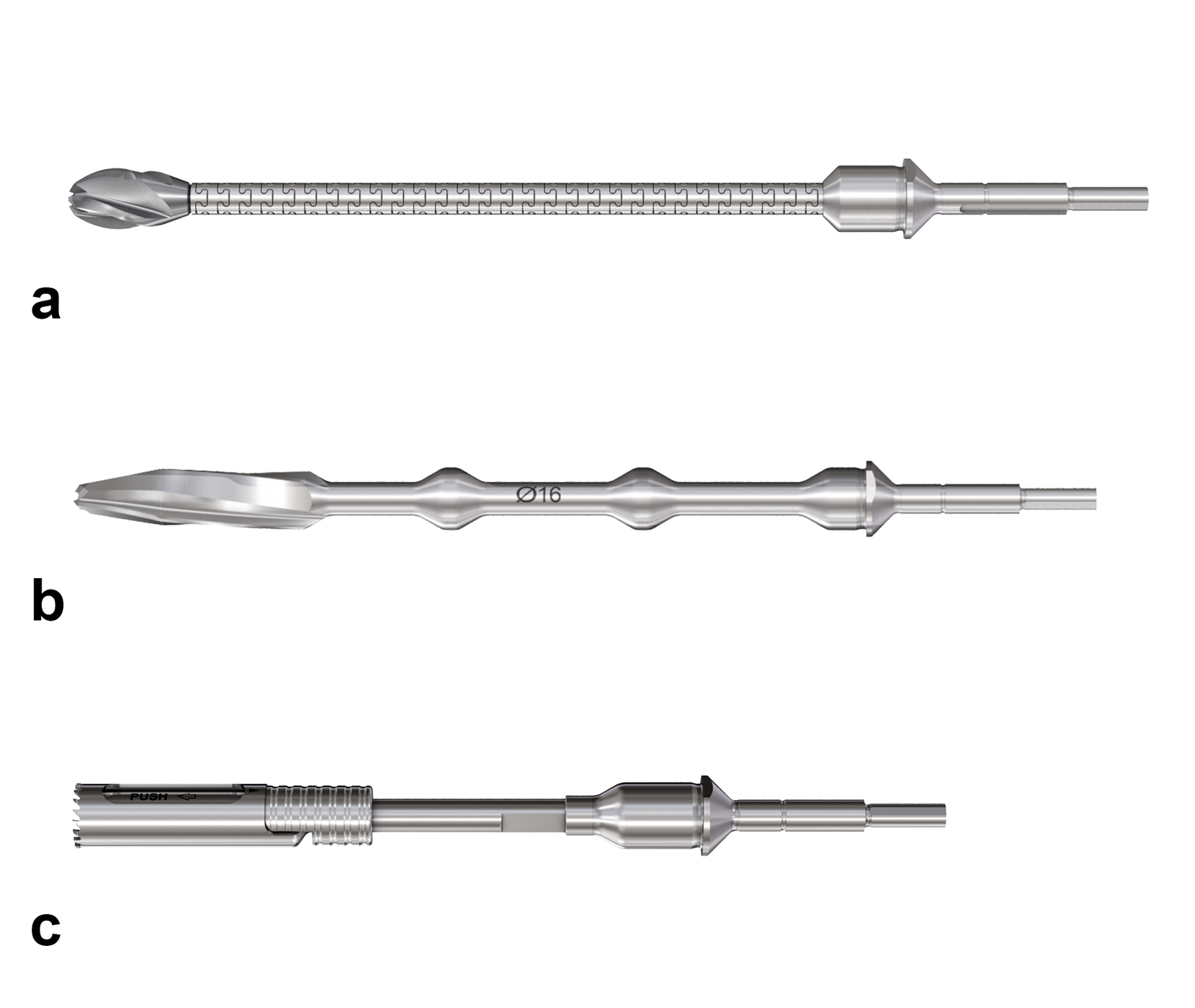 When using the hollow reamer, fracture fragments are not displaced because the instrument facilitates the removal of a cylindrical bone plug from the insertion area (Fig 6) without causing radial displacement forces to the surrounding bone.