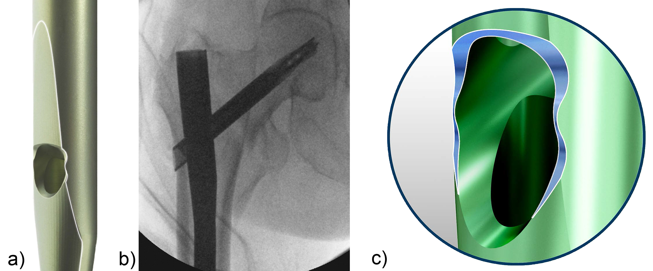 The combination of a large proximal nail diameter and a very lateral entry point has been identified as a potential reason for such a loss of reduction. As a result, a smaller diameter nail with a laterally flattened profile to more appropriately respect the anatomy of the proximal lateral femoral wall would be advantageous. Both design features have been realized with the new nail. The smaller 15.66 mm proximal nail diameter of the TFNA (compared to 16.5 mm and 17 mm for PFNA/PFNA-II and TFN) and the LATERAL RELIEF CUT design (Fig 4) of the proximal nail end serve to reduce the potential impingement of the nail with the lateral femoral wall and the HNF. Both of these issues could result in varus malalignment and a loss of reduction, which remain key indicators for an increased risk of cut-out. The small proximal nail diameter also helps to preserve bone in the insertion area, which is especially beneficial in the femora of small stature patients.