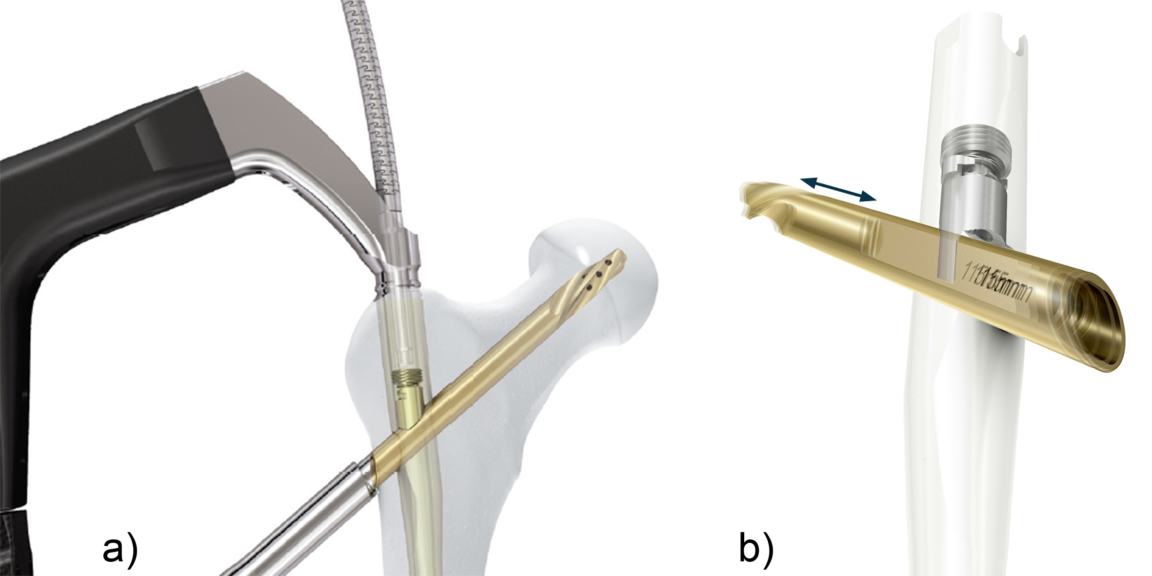 When the TFN-Advanced proximal femoral nailing system was launched in 2015, flexible and solid drill bits were offered to prepare the entry path of the nail. When fracture lines are located in the area of the intended nail insertion point, fracture fragments can be pushed apart when introducing these drill bits through the fracture lines causing a varus malreduction of the head-neck fragment. In order to avoid this clinical problem, an optional hollow reamer has been developed (Fig 5).