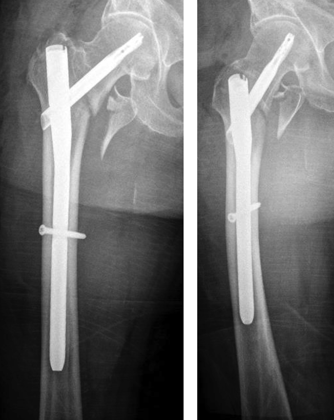 An 83-year-old female patient sustained a 31-A.2.2 fracture of the right proximal femur after a fall at home (Figs 1-2). Intraoperative and postoperative images are shown (Figs 3-5).
