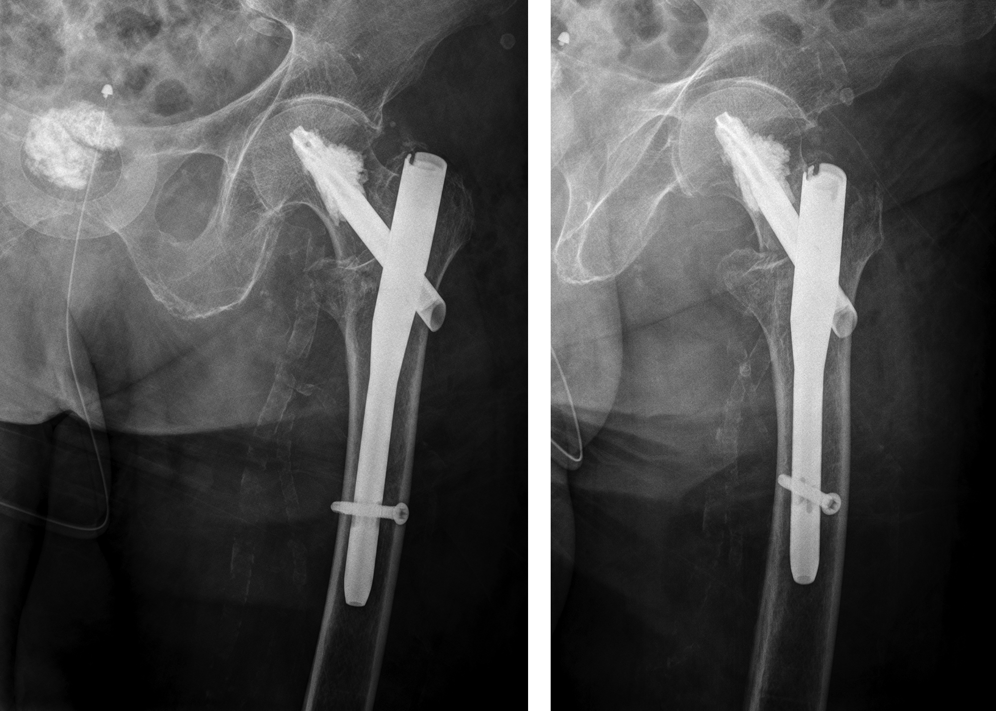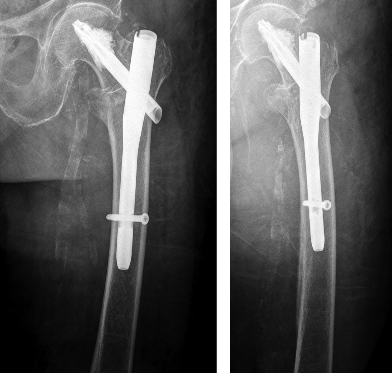 A 98-year-old female patient sustained a pertrochanteric fracture of the left proximal femur due to fall in her nursing home (Fig 1). There was significant pain and coxarthritis in the right hip, and hypertension. Surgery was performed within 24 hours. There was an indication for augmentation due to the instability of the fracture. The patient additionally suffered from osteoporosis and dementia.