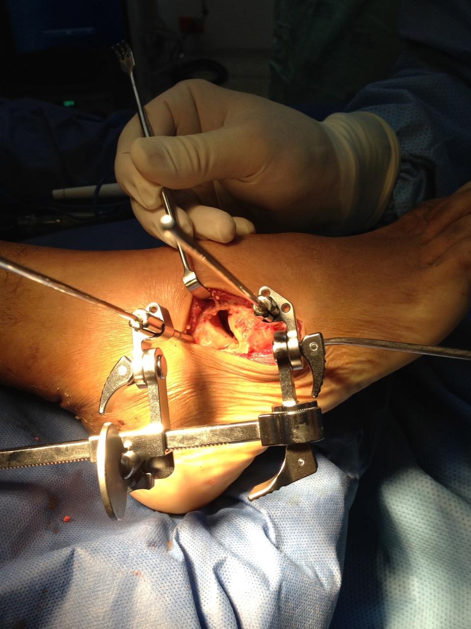 The picture shows the use of the Compression/Distraction Device in the midfoot