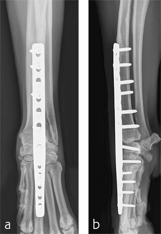 Postoperative radiographs revealed proper joint orientation and compression of the multiple antebrachiocarpal joint levels (Fig 5). Implant placement was considered excellent.