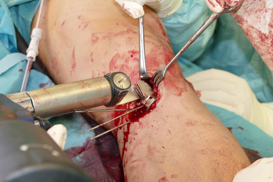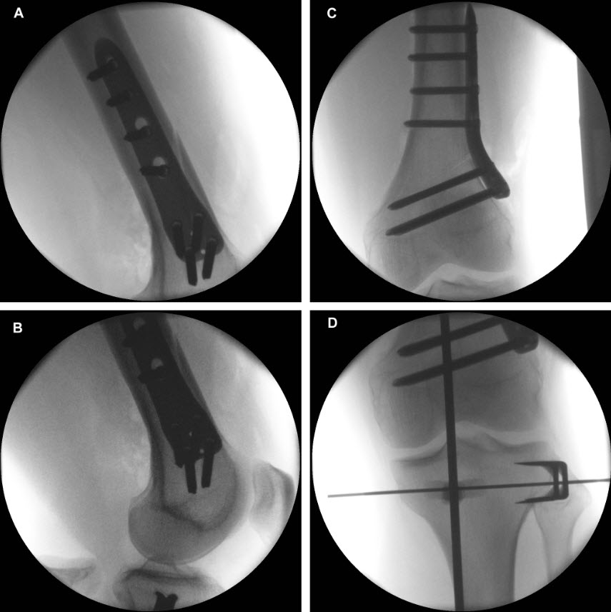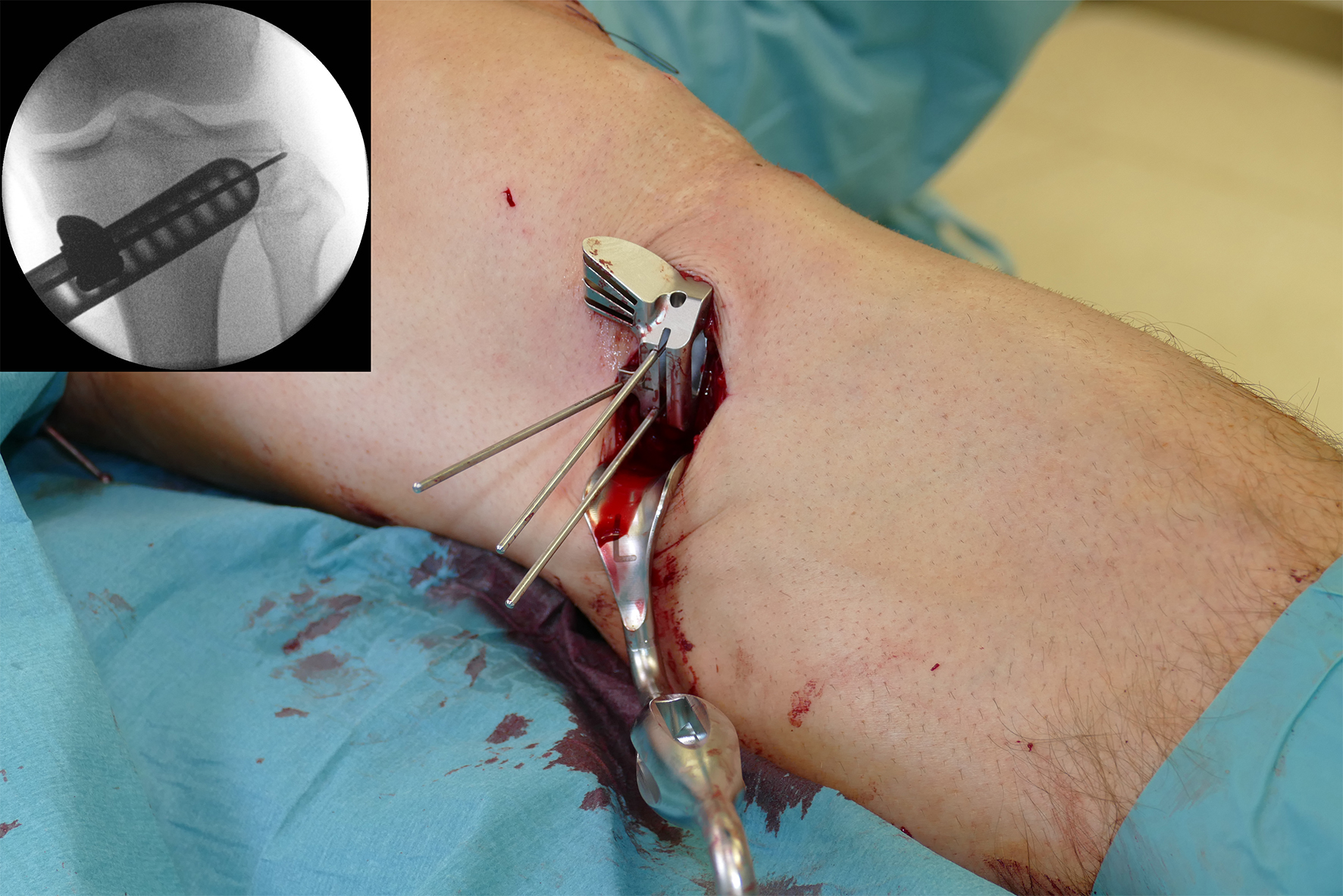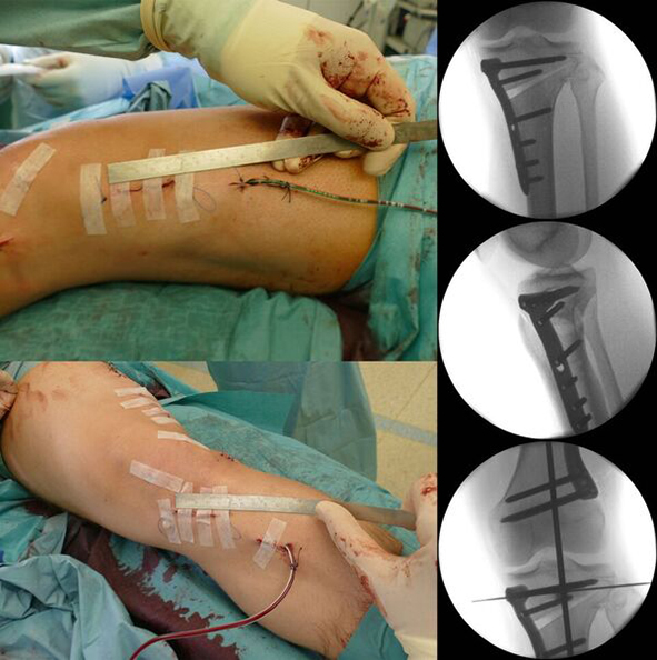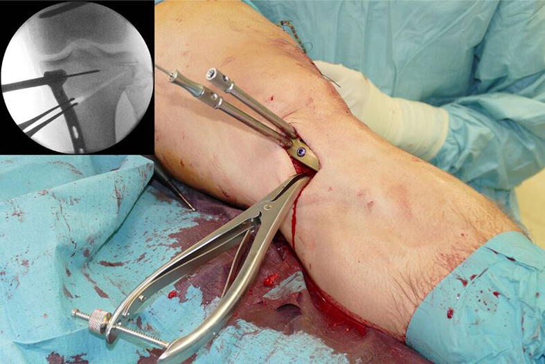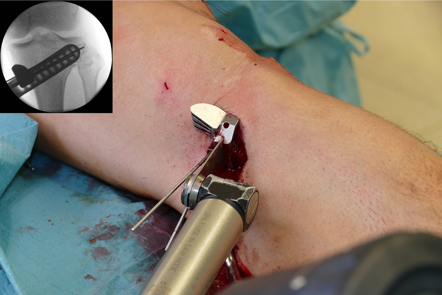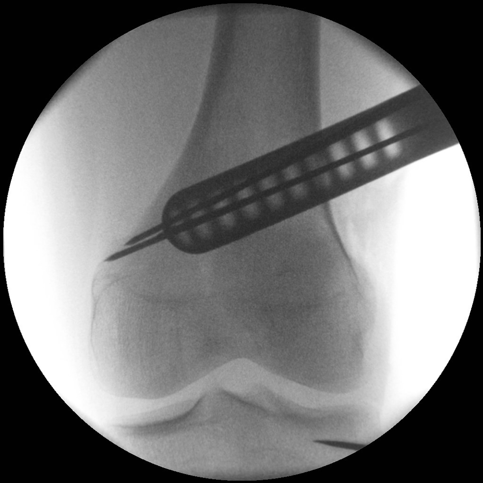 Surgery was initiated with an arthroscopy. No cartilage lesion was observed and removal of the lateral staples followed. The osteotomy started at the femur as a lateral closed wedge biplanar DFO. The new radiolucent hook from the TomoFix Anatomical system was tested during this aspect of the procedure. The hook is ideal in the adoption of a minimally invasive approach for use in patients with normal soft tissue (Fig 9).