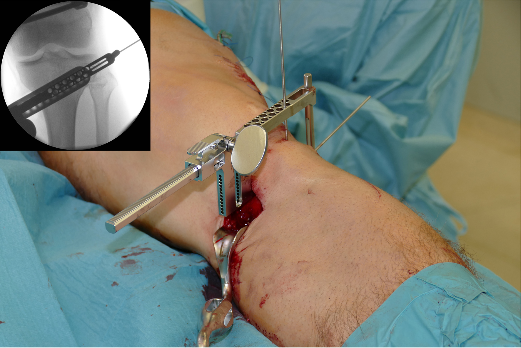 Following completion of the DFO and fixation with the TomoFix MDF Anatomical (Fig 10) the new aiming arm and K-wire guide system was used for the open wedge HTO.