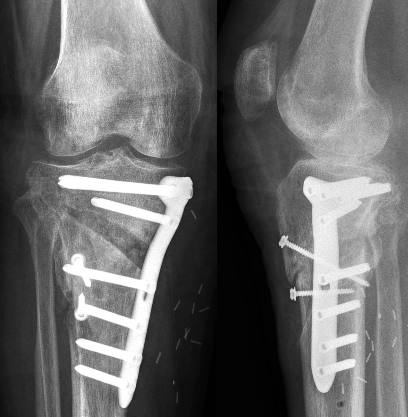 Not only does the new TomoFix Knee Osteotomy System contain a new MHT plate with more anatomical features, it also includes new osteotomy instrumentation intended to improve both surgical accuracy and procedural efficiency. The new instrumentation is compatible with the existing Standard and small TomoFix Medial High Tibia plates. Fig 4 shows a patient with post-traumatic deformity after a proximal tibial fracture (at the 6-week follow-up after open wedge HTO in descending technique and fixation with the TomoFix MHT anatomical plate).