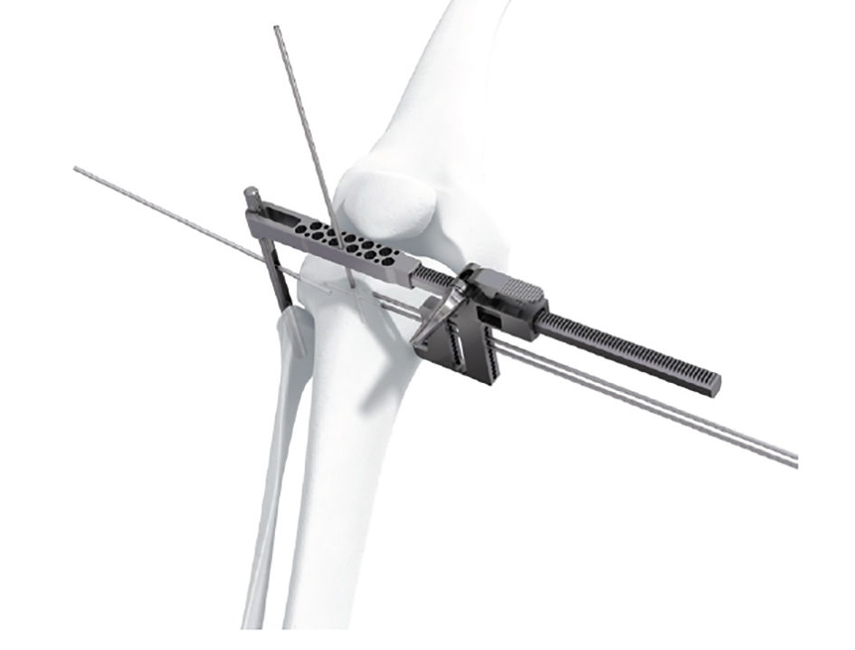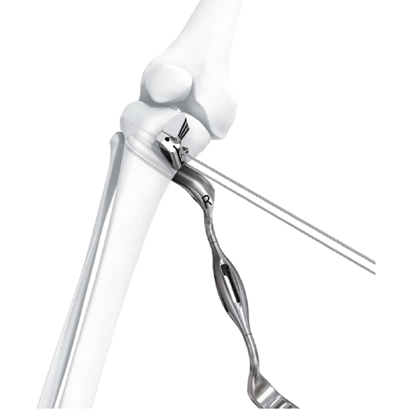 - The aiming arm and K-wire guide support the insertion of K-wires to help maintain tibial slope and aim at the hinge points (Fig 5)