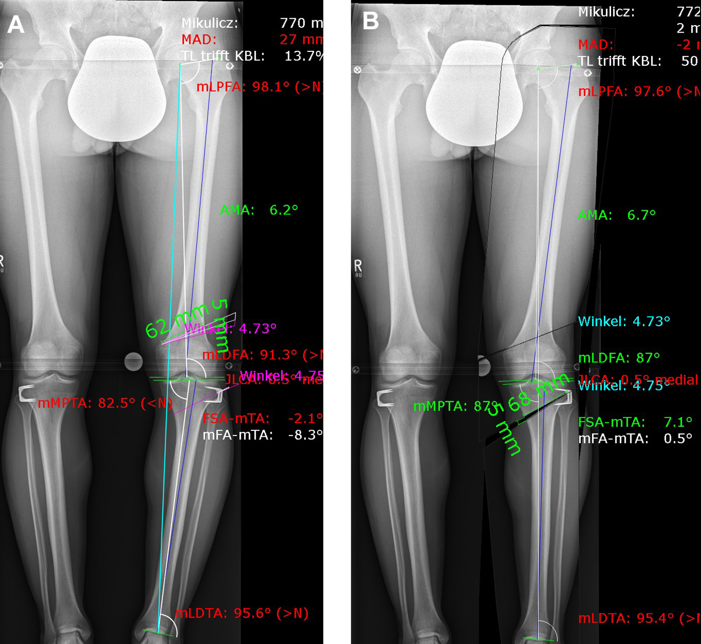 A patient presented with a congenital varus malalignment and complained of medial knee pain following epiphysiodesis at the proximal tibia. The MRI showed no cartilage lesion. A varus deformity of -8 in conjunction with medial knee pain was the indication for surgery. Fig 8 presents the deformity analysis of the left knee. Because of the deformity in the distal femur and proximal tibia, a double level osteotomy was planned and digitally simulated. The image on the left shows a combined deformity comprising a mechanical tibiofemoral angle (mTFA) of -8, a mechanical lateral distal femur angle (mLDFA) of 91, and a mechanical medial tibia angle (MPTA) of 83 (A). The image on the right shows the simulation of a double level osteotomy (B). Aim was a mTFA of 1 (valgus), a mLDFA of 87, and a MPTA of 87. The distal femur osteotomy was planned as a closed wedge distal femoral osteotomy (DFO) and the tibia osteotomy was planned as an open wedge HTO.