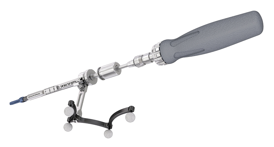 With Compartment 2, key instruments can now be navigated with navigation arrays and adaptors (Fig 3). There are two Universal Navigation Adaptor Sets (UNAS)—one set that can be used with a Medtronic SureTrak(R) II array and be manually calibrated to the Medtronic Stealth Station navigation system. The other set works directly with Brainlab, and includes pre-calibrated instruments and new, aligned Brainlab Software that can substantially improve the surgical workflow. The cannulated screws provide a potentially less invasive technique for the insertion of cervical pedicle screws.