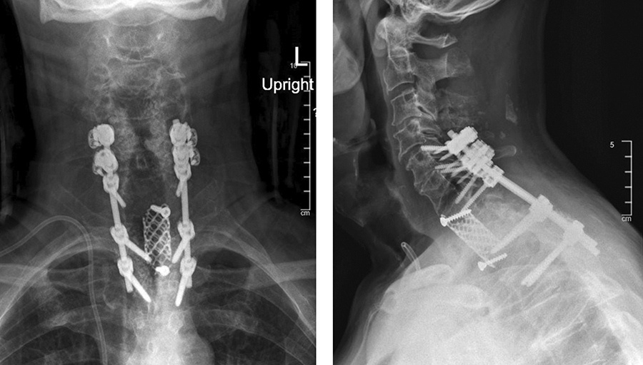 · C5-T3 posterior instrumentation with the DePuy Synthes SYMPHONY OCT System. Given the patient’s suboptimal bone quality, C5 and C6 lateral mass screws were reinforced with two MULTIPOINT SECURE screws placed bilaterally for an additional eight screws (Fig 7).