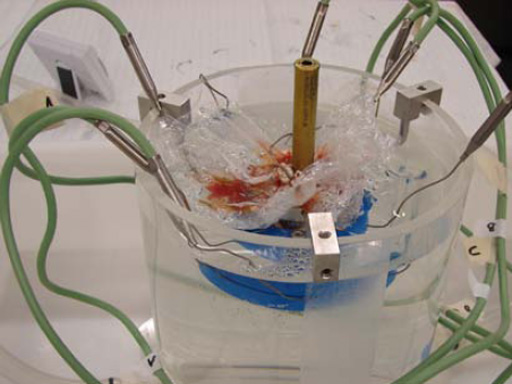 Cylindrical samples from six pairs of fresh frozen human specimen femoral heads were used in this study. The specimens were assigned to two study groups for a randomized left to right comparison: 3 ml versus 6 ml cement. After centric insertion of the PFNA blade, six 1 mm holes were drilled radially around the tip of the implant allowing tight fitting of six K-type thermocouples at varying distances to the center of the blade (Fig 11). To simulate physiological conditions the samples were placed in a 37°C water bath (Fig 12). Bone cement (Vertecem V+)* was injected in a standardized manner and temperatures were continuously recorded until full curing of the cement. Maximal temperatures were identified for all thermocouples.