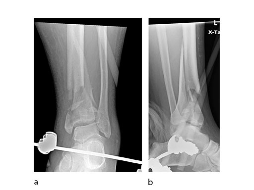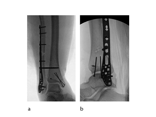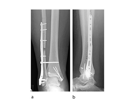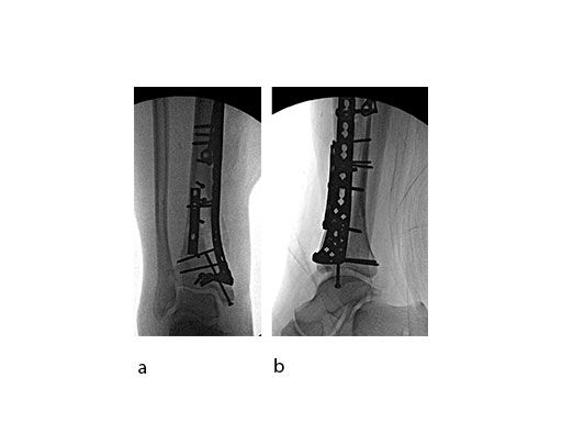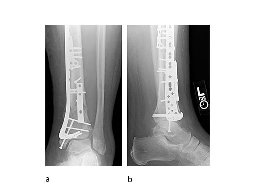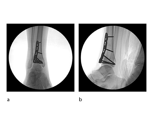 A 45-year-old patient fell from his horse, receiving a closed bimalleolar fracture/ dislocation (Fig 10). Computed tomorgraphy demonstrated an additional anterolateral avulsion injury and syndesmosis dislocation. Osteosynthesis was conducted with a VA-LCP Lateral Distal Fibula Plate.