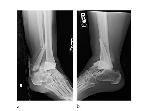 A 17-year-old male patient was involved in a snowboarding accident. This was a closed injury, and he was initially splinted for 10 days. His injury pattern demonstrated anterior articular impaction (Fig 1).