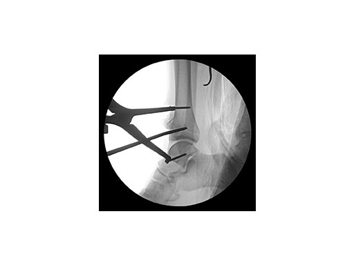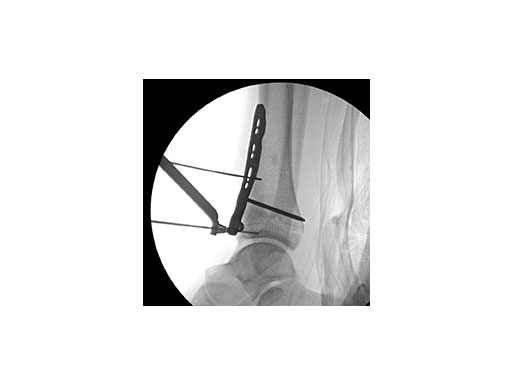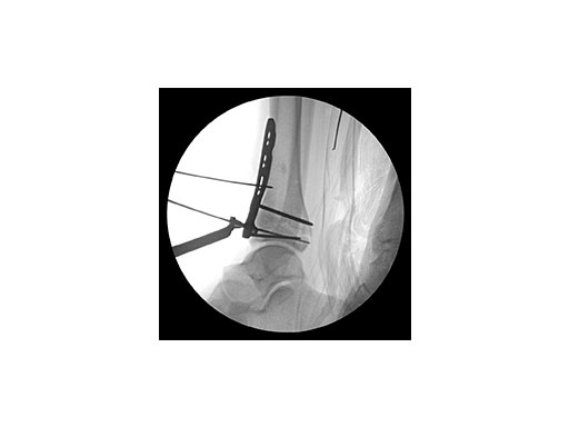 Surgeons performed an anterolateral surgical approach and distracted the joint using the distraction clamp and osteotome (Fig 2). The fracture was fixated with a VA-LCP Anterolateral Distal Tibia Plate (Fig 35).