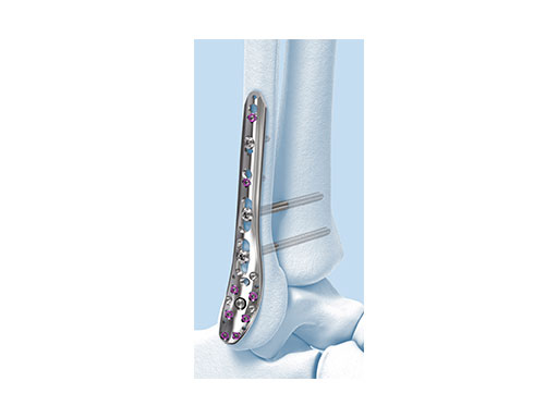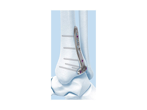 - VA-LCP Anteromedial Distal Tibia Plate: The anterior arm of the plate aids in capturing small articular bone fragments and has three 2.7 mm VA locking screw holes