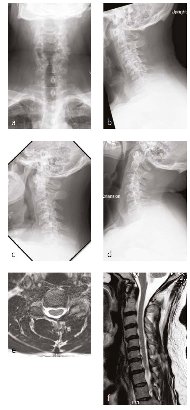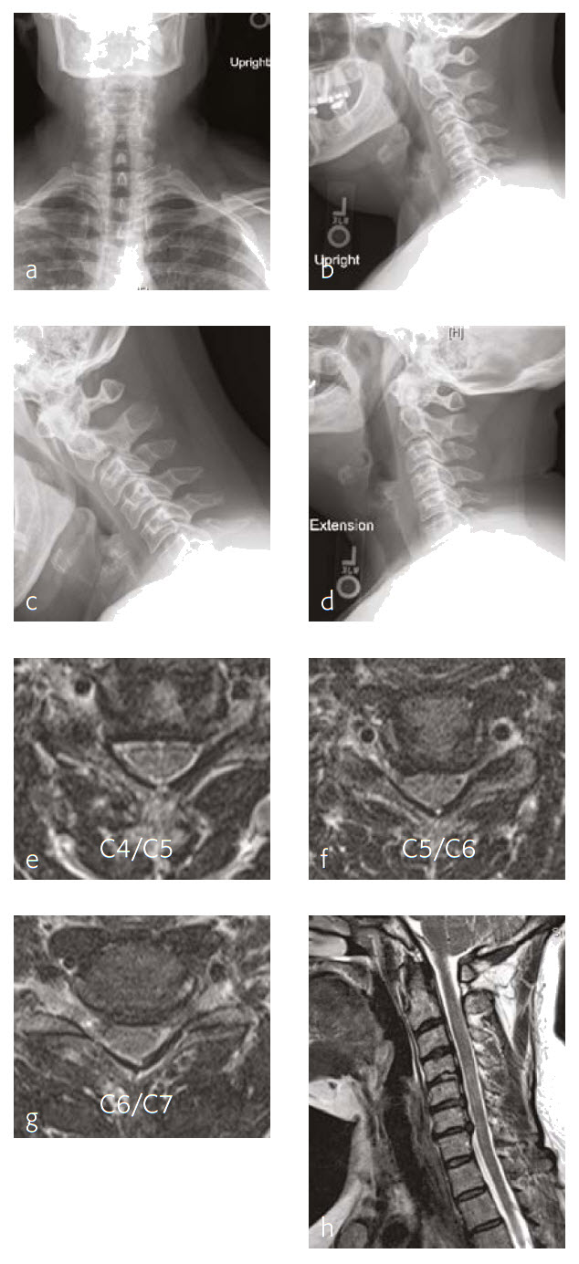 A 46-year-old woman presented with one-year history of neck pain, upper extremity paresthesia, weakness, and subjective numbness (Fig 5). Her right upper extremity was worse than her left, with loss of function and debilitating pain. She described cramping in her upper extremities without etiology and without alleviating factors.
