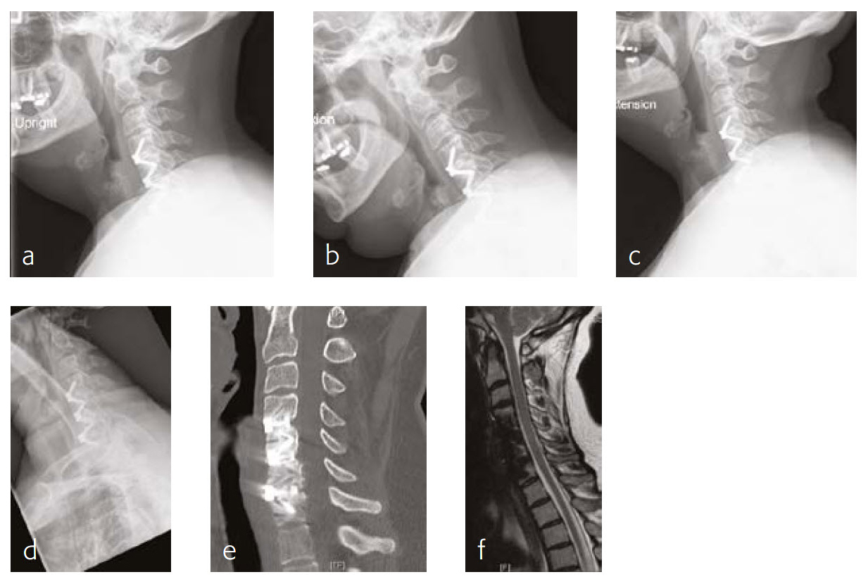 The patient showed normal lordosis in his extension x-rays. He has approximately 2 mm of anterolisthesis of C4 on C5 in his extension on his flexion x-ray. This increases to approximately 56 mm and persists in his normal upright film with again some component of spondylolisthesis at that level.