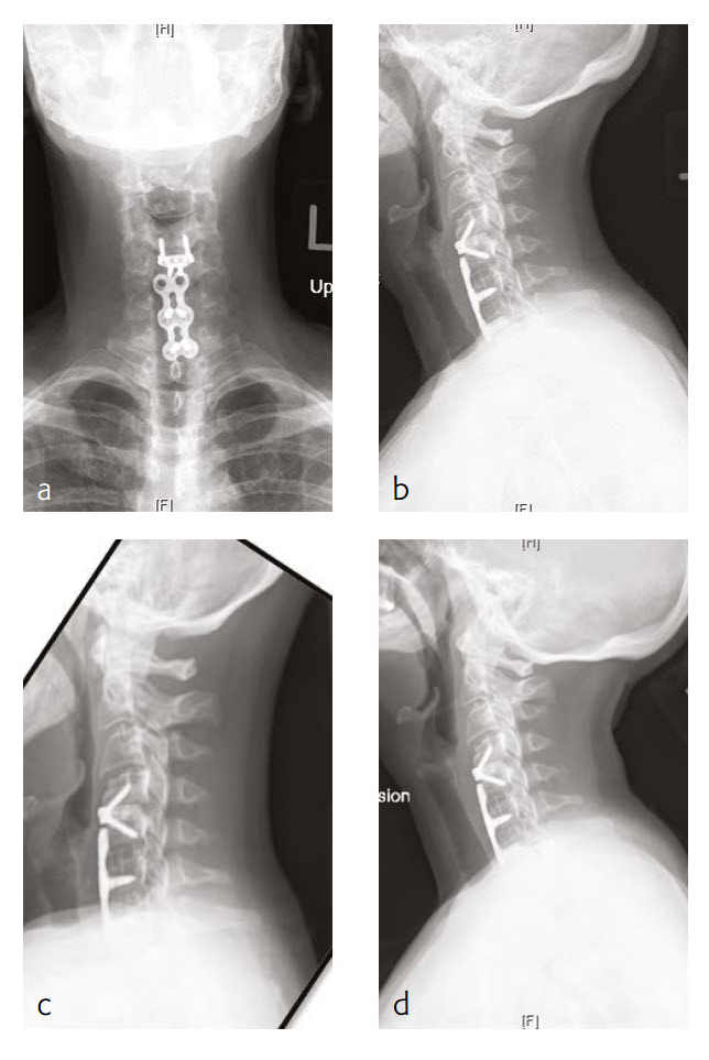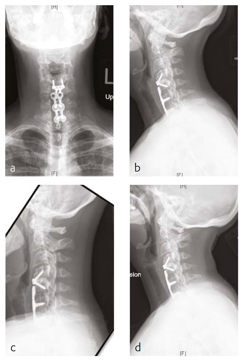 The patient works at a grocery store as a produce stocker and has a history of C5 through C7 ACDF done in 2005 (Fig 3). Her symptoms were relieved at that time, but she had quite severe neck pain and bilateral radicular symptoms. She had chronic C6 radiculopathy since recovery from that procedure, however, was able to return to work. Unfortunately, over the last 34 months, she has had a recurrence of symptoms, with constant neck pain and occasional cervicogenic headaches.
