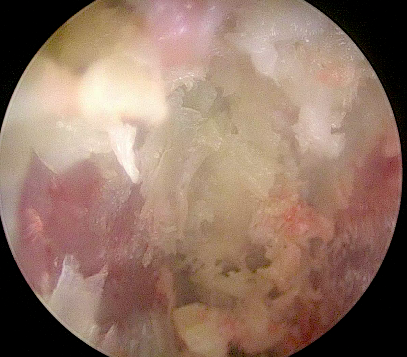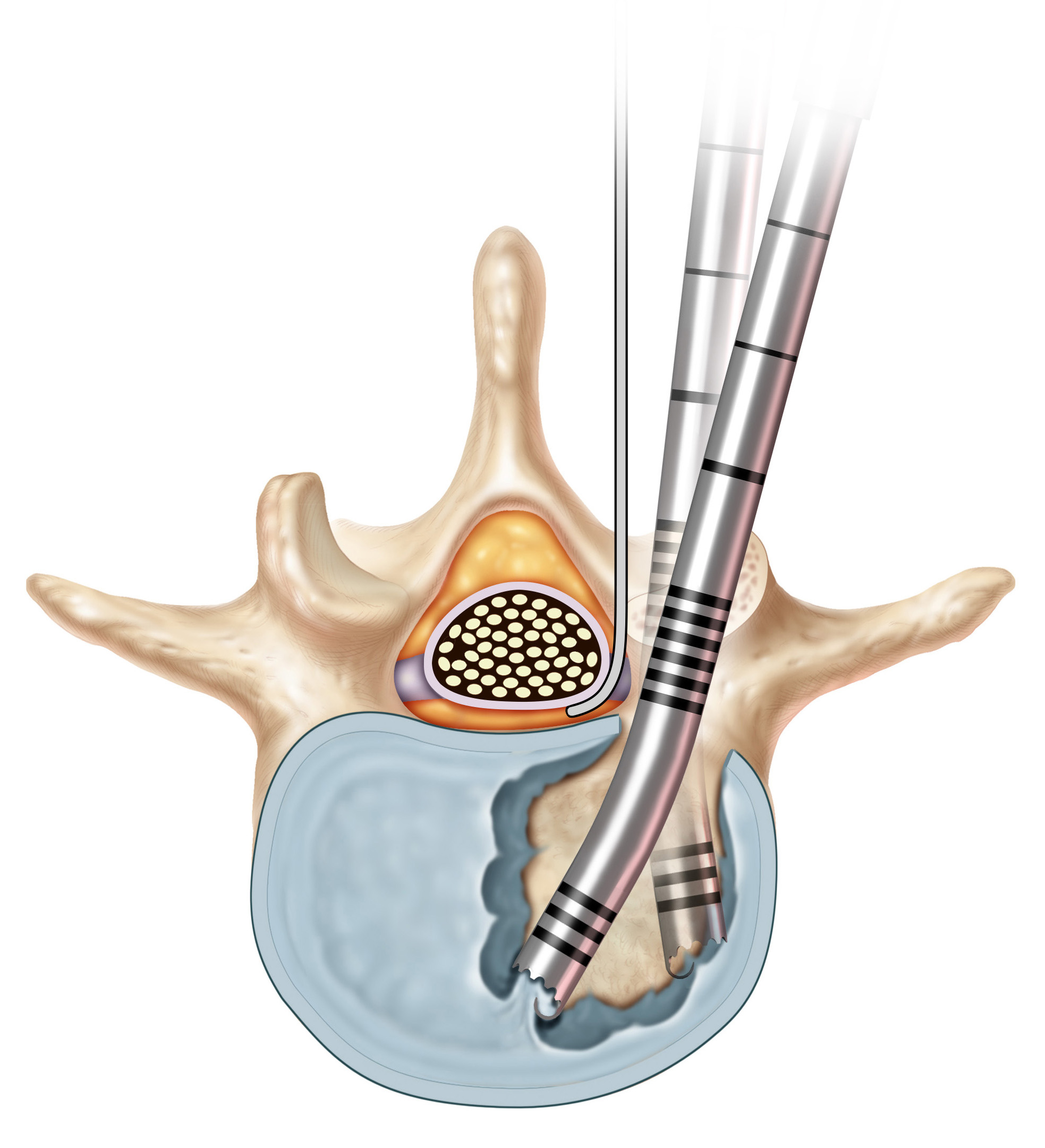 Although surgeons assume that posterior discectomy performed with traditional tools can adequately prepare the vertebral endplates for fusion, cadaveric studies have shown that an aggressive discectomy usually removes no more than 60% of the disc material [1]. In a recent cadaver course, participants were asked to work consecutively 20 minutes on the disc removal through a tubular portal. An endoscope control was then performed for direct visualization of the endplates. To the surprise of the participants, they had to admit that the disc preparation was not as good as they had anticipated. They all agreed that complementary discectomy and endplate preparation was needed (Fig 1).