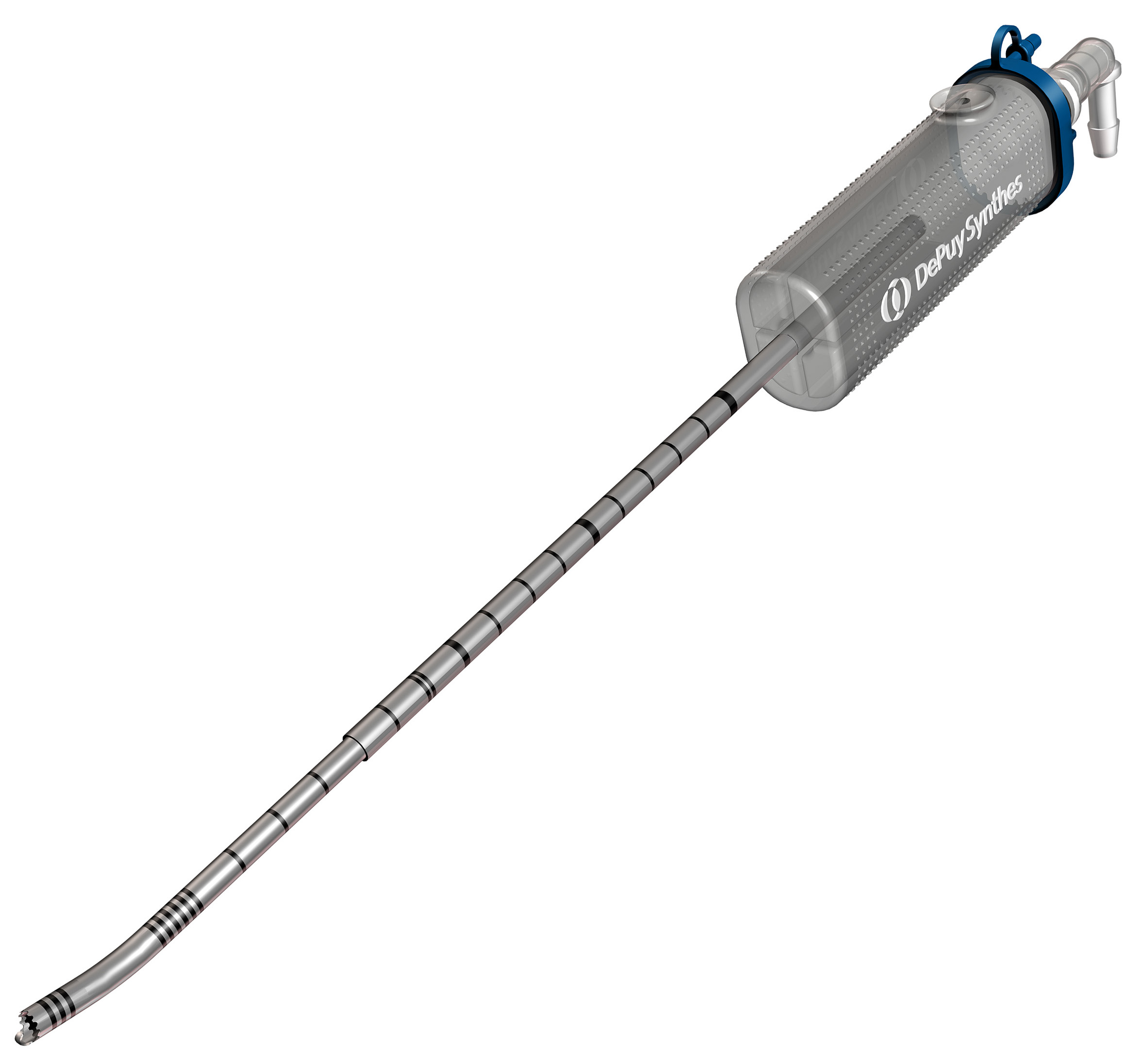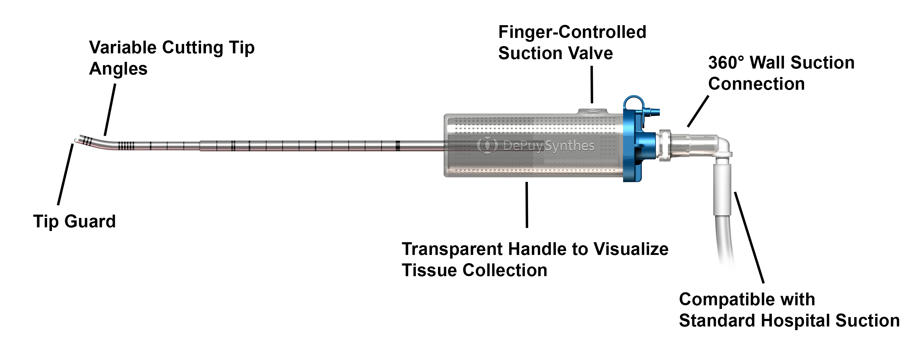 The CONCORDE Clear MIS Discectomy Device is a single-use instrument that removes the degenerated disc and prepares the endplates using readily-available standard hospital suction (Figs 2 and 3). The instrument is available in angles of 15°, 30°, and 40° and two lengths (220 mm, 270 mm) to accommodate various approaches. The diameter of the tube is 5 mm. The cutting edges shear the disc material from the endplates while the suction draws the disc material into the transparent handle, which allows surgeons to immediately see the collection of disc material. This discectomy technique requires fewer tool passes and instrument exchanges when compared to traditional techniques. The time saved from reduced instrument steps/passes may lead to reduced OR costs.