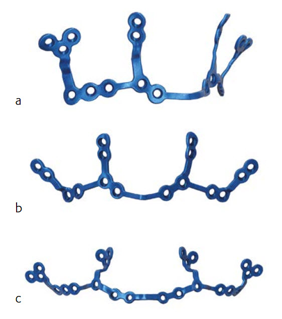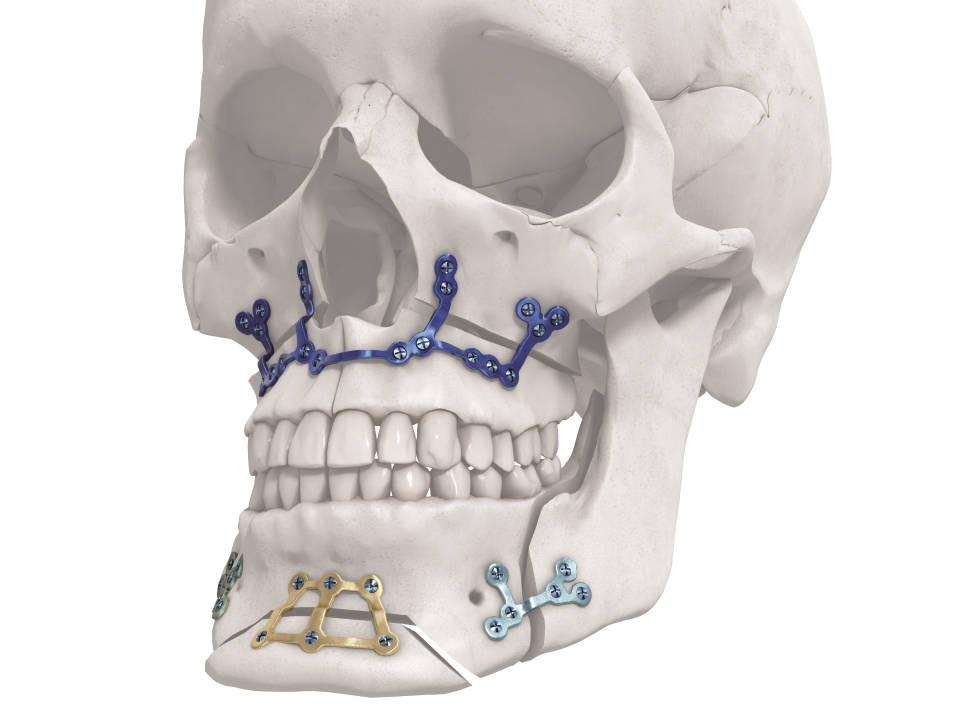 The titanium 3-D printed plates are individually designed to meet the requirements of patients and surgeons, and exist in different designs (Le Fort I, bilateral sagittal split osteotomy (BSSO) and genioplasty plates, Figs 2-4). The plates are intended to be used in conjunction with the titanium 3D-printed guides. The screw locations and vectors are defined according to surgical access, bone volume and the avoidance of key anatomical obstacles (nerves, tooth roots). Markers facilitate correct plate placement, and the plates are available with either 0.8 mm or 1.0 mm profile. The plates are compatible with MatrixOrthognathic and MatrixMidface screws and drill bits.