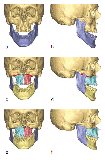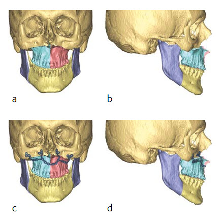 Preoperative multi-slice computer tomography (MSCT) was obtained and uploaded in Proplan CMF Connect. During a web-based meeting with a clinical engineer, the surgical procedures were planned (Fig 13). The skull was oriented in the natural head position in accordance to the Frankfurt horizontal plane and the bi-pupillary line, and a two-piece Le Fort I osteotomy with maxillary advancement and posterior impaction was planned. The plan included a posterior maxillary widening to compensate the transversal deficiency in relation to the mandible. A bilateral split osteotomy with mandibular setback and autorotation was simulated to achieve the final occlusion (Fig 13c-d). As the final step, the midline, the position of the incisors, the maxillary canting and the chin position were checked in relation to the facial midline, the lips and the natural head position. Fine tuning of the position was performed by moving the mono-block out of maxilla and mandible in final occlusion. A soft tissue simulation in the planned position of the bones was also performed (Fig 14).