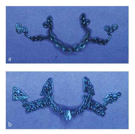Maxillary positioning in all three dimensions (sagittal, transversal and vertical) was achieved by fixing the patient specific plate in accordance with the pre-drilled screw holes at the maxilla first and at the midface second (Fig 19a). Additional transversal stability of the two-piece Le Fort I osteotomy was achieved by using a transversal wire enforced palatal plate which was manufactured prior to surgery by the dental technician.