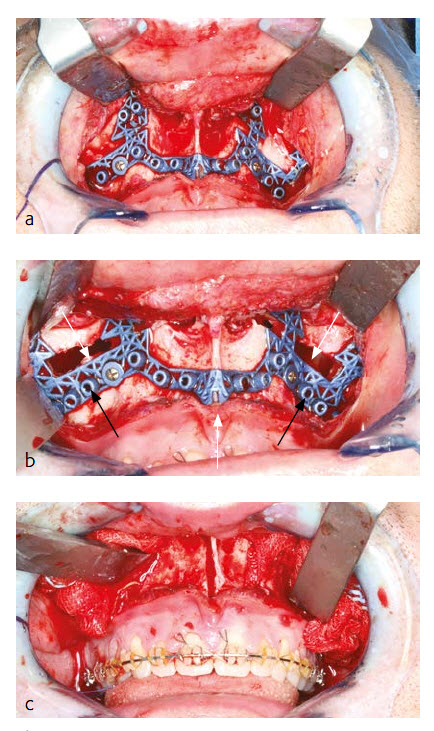The new maxillary position in sagittal, transversal and vertical dimension is encoded in the shape of the patient specific plate. No additional splint (wafer) or intraoperative measurements were necessary for positioning of the maxilla. After closing the maxilla, a classical BSSO with semi rigid SplitFix fixation was performed (Fig 19b) and the final occlusion (Fig 19c) was adjusted using a splint (wafer) in final occlusion.