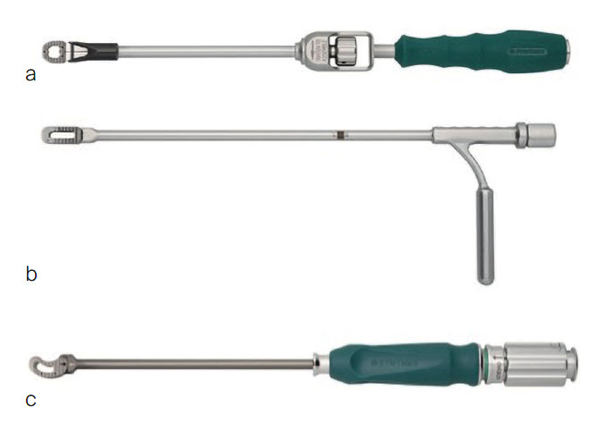 The PROTI 360 cages are available as sterile implants and are compatible with ACIS System (Fig 9a), T-PAL Interbody System (Fig 9c) and CONCORDE Bullet (Fig 9c) instrument sets. The ACIS implants are available in 5-10mm heights, in Lordotic Small, Standard, and Large designs and in Parallel Standard or Convex Standard. The CONCORDE implants are available in Parallel and Lordotic designs (7-15 mm heights, 23 and 27 mm lengths). The T-PAL implants are available in the High Curve design (7-15 mm heights, 10 x 28, 12 x 32 footprints).