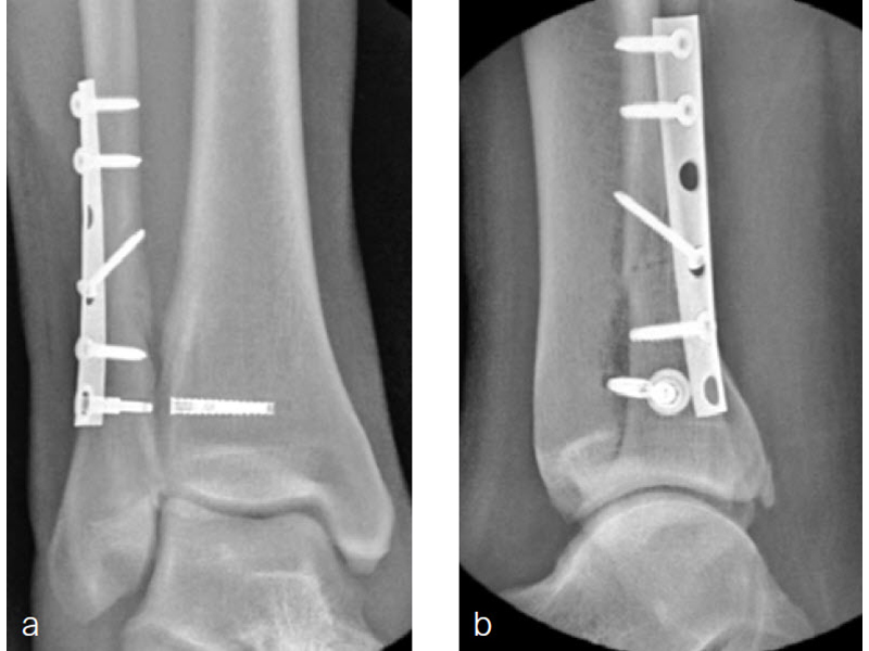 Suture button devices have been developed for “dynamic” syndesmosis fixation with the claimed benefits of allowing physiological motion of the distal tibiofibular joint, reducing the implant breakage rate observed in rigid screw fixation and avoiding routine implant removal. Their use has become increasingly popular due to these appealing device features. Sanders et al [10] in a randomized controlled study compared two 3.5 mm 3-cortex screws with a frequently used suture button device (Syndesmosis TightRope®, Arthrex, Naples, Fla) for syndesmosis fixation. The reoperation rate was significantly higher in the group with screws (30%) than in the TightRope group (4%), largely due to elective removal of screw fixation [10]. Additionally, malreduction rate (2 mm translation or 10° rotation threshold) was 39% in the group with screws compared with 15% in the TightRope group [10]. A randomized trial [11] compared suture button fixation (48 patients) and fixation with a single quadricortical syndesmotic screw (49 patients) for syndesmosis injury. At 2 years, the median American Orthopedic Foot and Ankle Society (AOFAS) score was higher in the suture button group than in the syndesmotic screw group (96 vs 86), as was the median Olerud-Molander Ankle score (100 vs 90) [11]. In a randomized controlled trial Ræder et al [12] found no differences in the AOFAS score at 2 years (median AOFAS score was 97 in both groups) after treatment with single tricortical 3.5 mm syndesmotic screw fixation (n = 47) and suture button fixation (n = 48). A systematic review [13] of the treatment for acute syndesmotic injuries found that the implant removal rate of TightRope was lower compared with that of syndesmotic screws, but still amounted to 10% (in 220 patients).