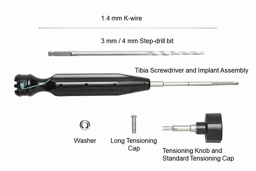 The implant components and instruments are provided in sterile, single-use kits (Fig 2). The standard Fibula Tensioning Cap is preattached to the Tensioning Knob. The self-tapping Tibia Screw is preloaded to the Tibia Screwdriver.