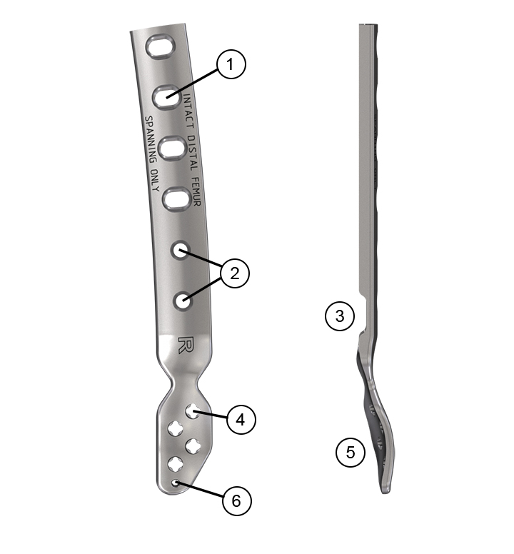 (5) Pre-shaped plate head to fit the intact distal femur and lateral femoral condyle.