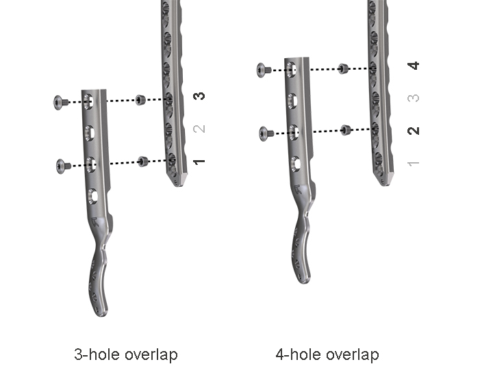 The VA-DSAP (Fig 10) attaches to both main plates (VA-PFP and VA-PFHP) to extend the fixation construct over the intact distal femur to the lateral femoral condyle. The plate overlap for the assembly must be either three or four holes (Fig 11). Two connecting screws are required to attach the VA-DSAP to two non-adjacent holes of the main plate. The VA-DSAP must not be used to span a fracture as this could lead to implant failure. The plate distributes stress among multiple points of fixation and is designed to avoid abrupt stiffness changes, thereby supporting the distal bone to protect it from further fractures.