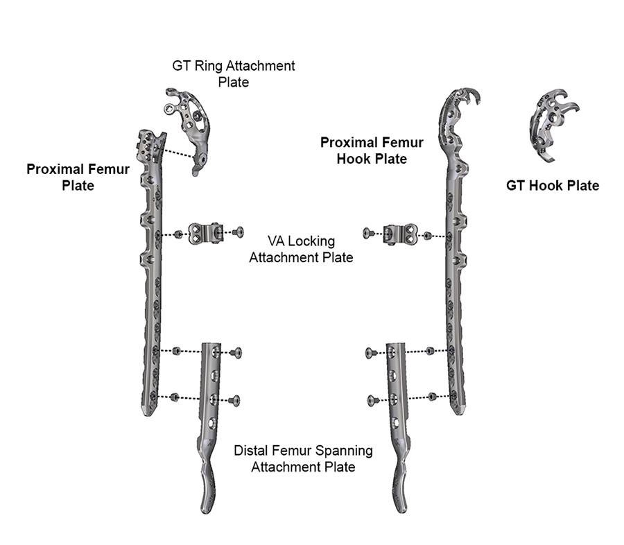 The Proximal Femur Plate and the Proximal Femur Hook Plate are the two main plates. The Greater Trochanter (GT) Ring Attachment Plate, VA Locking Attachment Plate and Distal Femur Spanning Attachment Plate can be assembled to the two main plates with threaded inserts and upper screws. A dedicated Greater Trochanter (GT) Hook Plate without plate shaft is available as standalone device for fixation of simple type AG fractures as well as greater trochanter osteotomies.